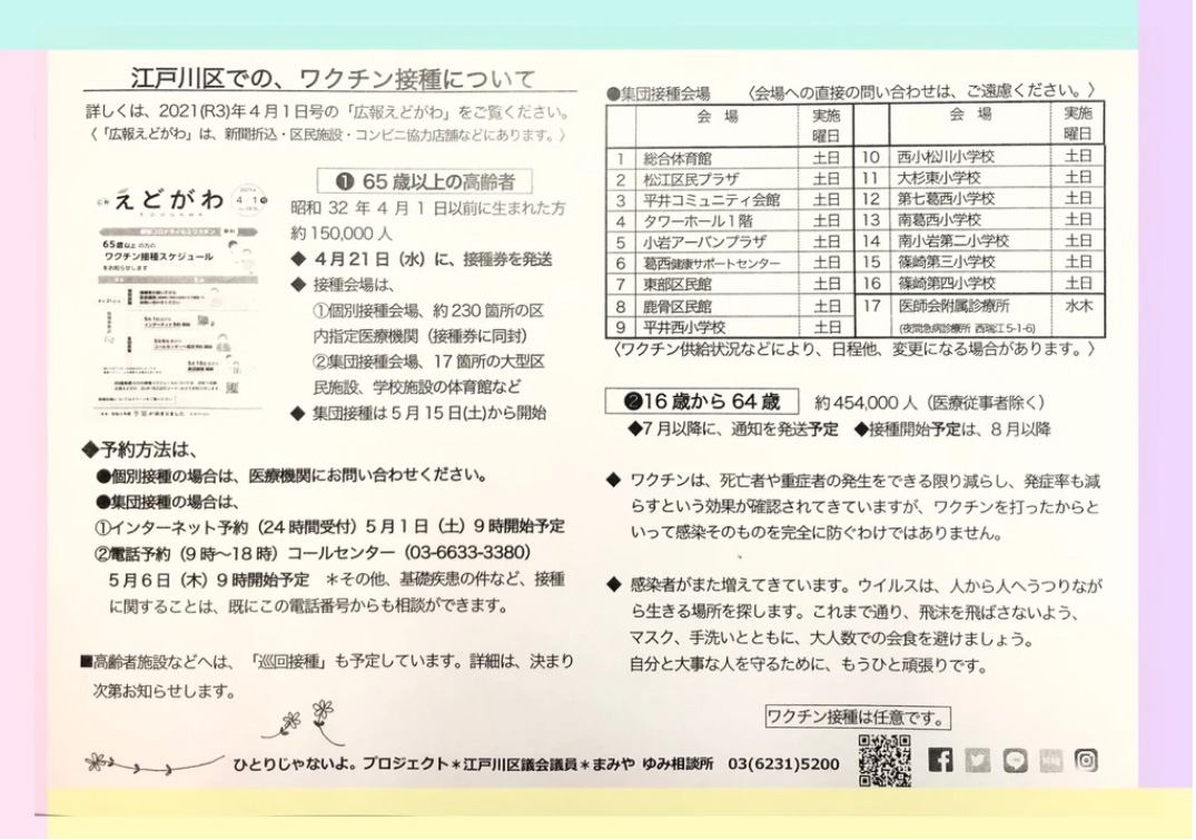 「ワクチン接種について」は、3/31に書きましたが、「広報えどがわ」に、たどり着かない方々もいらしゃり、どうなるの?と聞かれることも多くなってきましたので、改めて、整理して、プリントにしました。