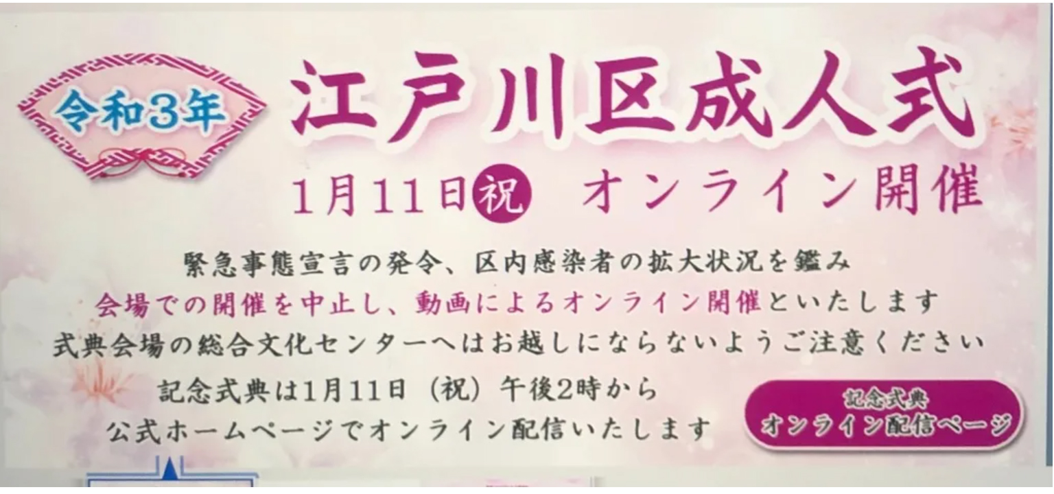 江戸川区成人式中止とのこと、私たち新成人と区民、また国民の健康を守るためのご決断に感謝しています。 さらに、現在、成人式を開催できる状況にないことも、十分に理解できます。 しかしながら、私たち新成人にとって、成人式という一生に一度の晴れの舞台を経験することができず、旧友との再会も果たせず、ここまで育ててもらった親に成人式での姿を見せることも叶わないということに対しては、納得が出来ません。