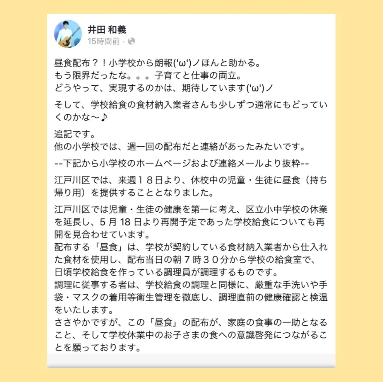 江戸川区教育委員会は、昼食を配食することを決めました。学校ごとにすでに連絡のあったところ、これからのところとあるようなので、朗報をアップしてくださった井田さんの思いもそのまま、シェアさせていただきますね。(詳細はのちに。)