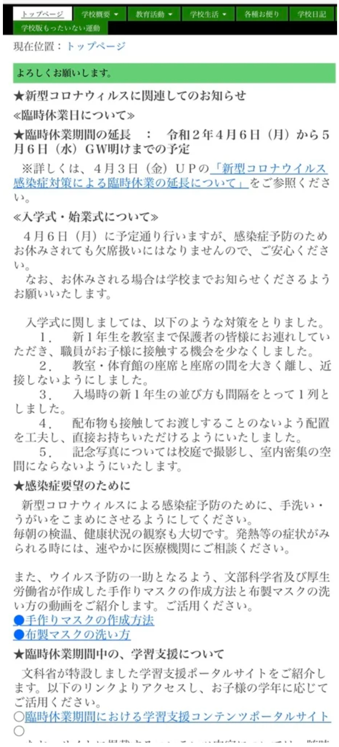 4月52020幼稚園・保育園・学校 明日が始業式・入学式の為たくさんのお問い合わせが来ています。 「欠席しても欠席扱いになりませんか?」 基本的には、臨時休業中のため欠席とはならないようです。万が一欠席扱いとなるなら学校にお問い合わせください。 「式の方法が心配」 各学校、リスクを極力減らすよう頑張っています。すでに明日のことのため変更は難しいかと思われます。ご心配であれば、ご家族でよく話してどうするかはお決め下さい。 写真はある学校のHPです。丁寧=安心につながるのだと、文章を読むとおもいます。 カテゴリー: 幼稚園・保育園・学校2020年4月5日タグ: 始業式入学式 Share this post Share on XX で共有 ピンするPinterest で共有 Facebook で共有Facebook で共有 LinkedIn で共有LinkedIn で共有 関連記事特別支援学級運動会。こどもたちに合わせて組み立てられています。2025年9月17日子どもたちへ♡9月1日ざわざわしていたら、いまの気持ち話せる人に話してね。もちろん私も聞くよ。学校休んだほうがいいよチェックリストもあります。2025年9月1日子どもからの相談がふえています。よく話してくれたね。あなたの今と未来は全方向に開かれているよ。2025年8月17日こどもの日。なくすのは虐待の連鎖。幸せになっていいんだよ。2025年5月5日卒業アルバムに掲載された情報の漏えいのおそれについて2025年4月17日江戸川区立船堀幼稚園入園式。生まれた時から子どもは全員が持っている「主体性」を大事にしてくれる幼稚園。2025年4月10日