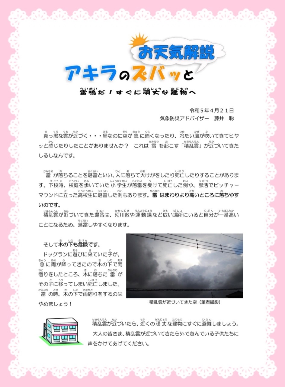 私、藤井さんの講義をお聞きしたことがあります。雷の怖さやどのように命を守るか(車の中、家の中に!固い建物がなければ両足そろえてしゃがむ)、などなど教えていただきました。
