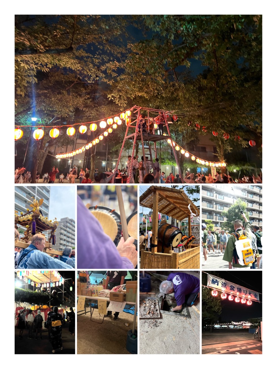 🌠一之江町会さんのお神輿には、お囃子隊がいるんです。水の噴霧器も大活躍!松二睦の皆さんと一緒に、私も、原白山會さんの半纏を着て行きました。夜の盆踊りでは、やっぱり「ダンシングーヒーロー」に子ども達が大盛り。