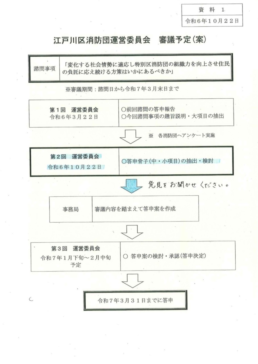 消防団員はご自分の書いたものしかわからないので、丁寧にまとめていただいたこの内容をこそ各分団におろし、意見を出してもらい、それを答申のまとめに生かしていただきたい。