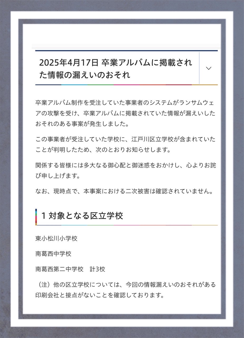 卒業アルバム制作を受注していた事業者のシステムがランサムウェアの攻撃を受け、卒業アルバムに掲載されていた情報が漏えいしたおそれのある事案が発生したということで、本日プレスリリースがありました。