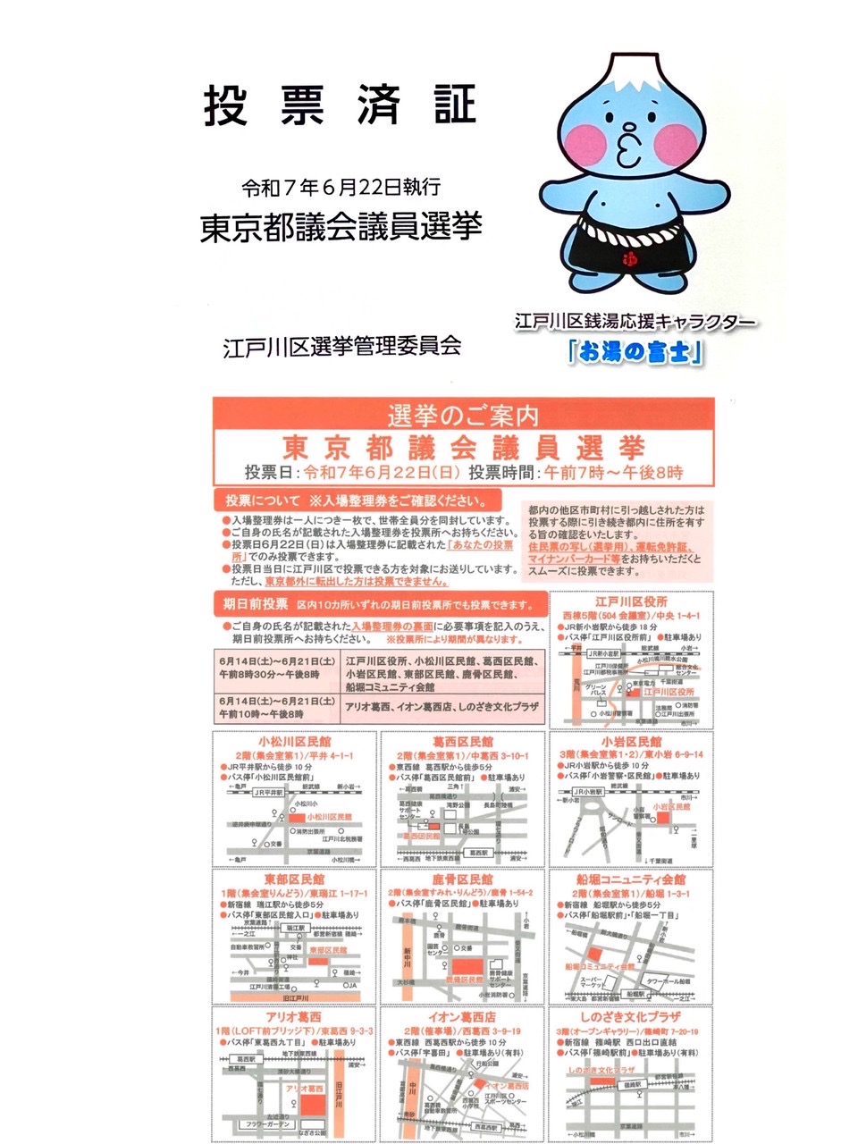 さて、東京都議会議員選挙は、いよいよ明日が投票日。今年の江戸川区の「投票済証」は「お湯の富士」ちゃんです。投票したら、投票済証くださいといえば、その場でもらえます。