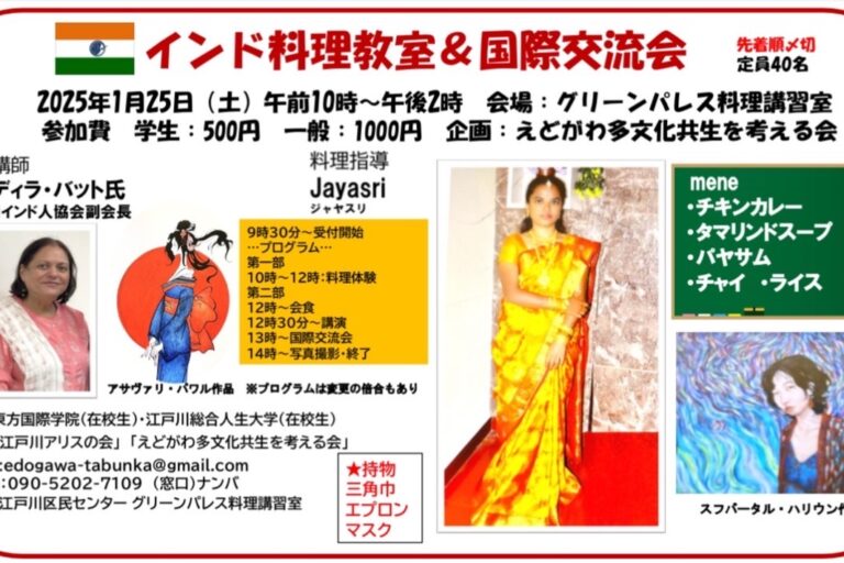 【インド料理教室&国際交流会】 お具合の悪い方がお出になったようで、あと何人か参加できるとのこと! ⭐︎明日1月25日土曜日 10時〜午後2時(全部の時間でなくても大丈夫です。) ⭐︎グリーンパレス料理講習室 …