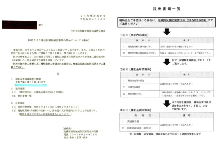 防犯カメラをつけておられる町会、自治会などのみなさん、 電柱使用料の補助金の締切が、1月31日となっています! 1月31日までに提出する書類は、右側に書いてある、1回目【事前内容確認】に書かれている、 1、電柱使用料の請…