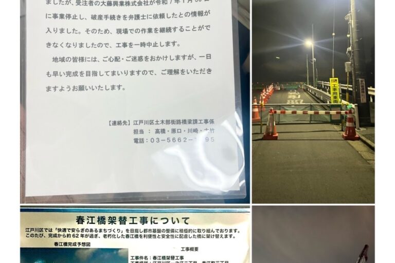 春江橋、工事業者が破産手続きを弁護士に依頼したと、報告がありました。 現在、春江橋の架替工事は、47〜48%の工事が進んでいるそうです。 工事を行うにあたり、区から、工事業者には、40%の前金を支払っています。 これにつ…