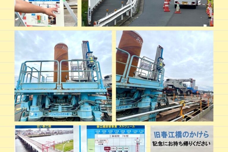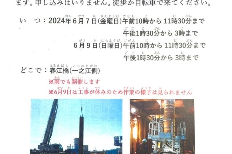 こんにちは^_^ 「春江橋」の工事現場を見てみませんか。 申し込みはいりません。 徒歩か自転車で来てくださいとのことです。 詳細はチラシをご覧ください。