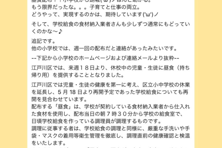 江戸川区教育委員会は、昼食を配食することを決めました。学校ごとにすでに連絡のあったところ、これからのところとあるようなので、朗報をアップしてくださった井田さんの思いもそのまま、シェアさせていただきますね。(詳細はのちに。…