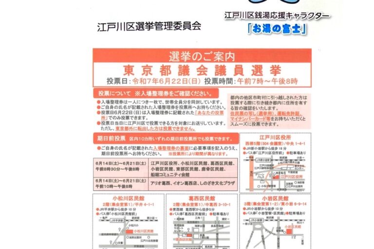 こんにちは。今日もまた30度越え!水分と塩分と涼しい場所(公共の場所もOKです!)を確保してくださいね。 さて、東京都議会議員選挙は、いよいよ明日が投票日。今年の江戸川区の「投票済証」は「お湯の富士」ちゃんです。投票した…
