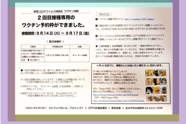 9月92021 ワクチン2回目専用予約枠 9/12受付開始 ひとりじゃないよ。プロジェクト 【ワクチン情報】 「2回目接種専用」のワクチン予約枠ができました。 接種期間:9月14日(火)~ 9月17日(金) 9月12日(日曜日)受付開始分 ■1回目の接種を終えた後、様々な事情で2回目の接種… 記事はこちら