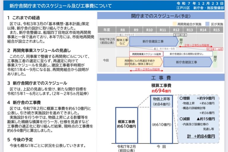 12月232025 「新庁舎」の開庁について 街づくり ◾️「新庁舎」の開庁は、2年〜2年5ヶ月延びることになりました。 13年1月の開庁予定▶︎15年1月〜6月の開庁予定となります。 ◾️工事費は、今年2月の公表(610億円)からさらに84億円増額され、694億円の予定です… 記事はこちら