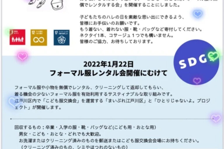 【卒入園学フォーマル服を寄付してください】みんなが笑顔でハレの日を迎えられるよう、着られなくなったフォーマル服を必要としている誰かにお届けします! まいぷれ江戸川区➕ひとりじゃないよ。プロジェクトが主催する「こども服…